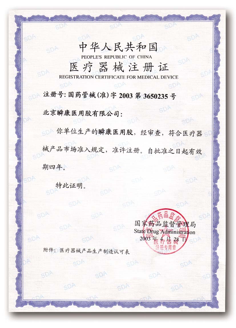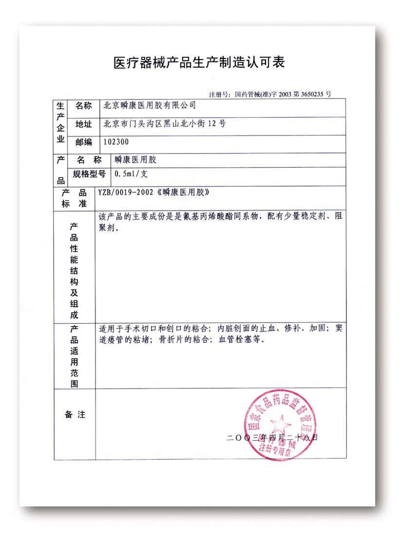 经过北京瞬康医用胶有限公司的不懈努力,深入研究,完善产品,加强临床研究,终于获得了国家食品药品监督管理局颁发的中华人民共和国医疗器械注册证(注册号:国药管械(准)字2003第3650235号);是首获批准的可全面用于内脏创面的止血、修补、加固,窦道瘘管的粘堵,骨折片的粘合,血管栓塞的医用胶产品。
