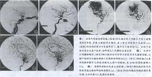 1例栓后1h发生再出血,另1例有轻度偏瘫外,其他原有临床症状均有明显改善。如头痛减轻(15/17)、癫痫发作次数减少发作时间缩短(6/9)、瘫痪肌力提高(5/7)、精神障碍好转(9/10)。因此我们认为当病灶巨大或位于重要功能区时,其目的只能达到部分闭塞AVM,改善其临床症状,减少AVM出血的危险性,欲达到完全闭塞是很困难的。故而栓塞不完全的AVM还可能发生再出血,其原因是当栓塞治疗AVM仅闭塞供血动脉而非畸形血管团时,周围的软脑膜动脉和皮质穿动脉就会新生滋养AVM的血管,使症状加重或再出血。再则每次栓塞都闭塞部分畸形血管团及供血动脉,保持AVM仍有流出通道。万一引流静脉被闭塞,应尽可能继续闭塞其余的供血动脉,以免入路不断,出路已绝,畸形团就易破裂出血。本组术后再出血1例亦属后者范围。但总的来看,大多数栓后病例还是控制了症状,防止了再出血。这足以证明运用真丝线段栓塞治疗脑AVM还是切实可行的(图2)。